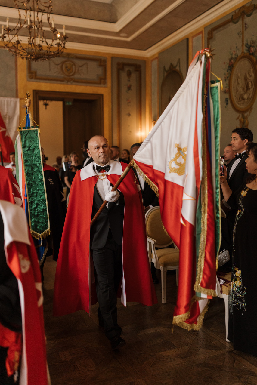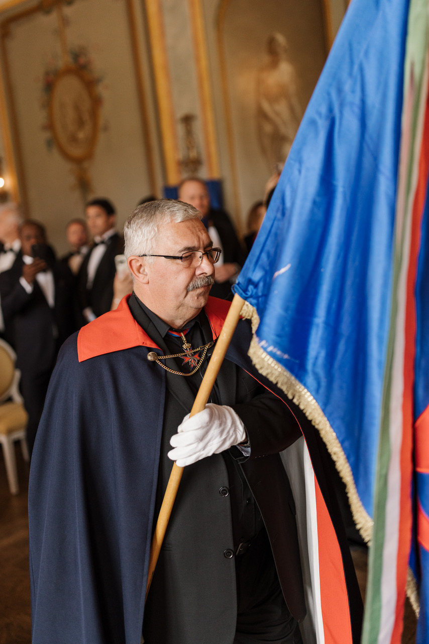 The solemn investiture of the Postulants started at 11.00 am in the presence of high-ranking guests, representatives of friendly orders in the marvellous Orangerie, its classical wall paintings were decorated with flags in the Red-White colours of our Order.