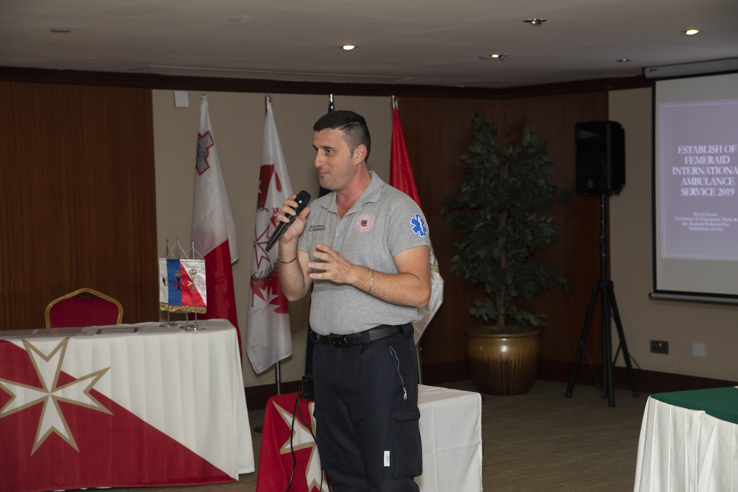 The event started on the 1st of November with the “Day of Honour”, dedicated to the Postulants by the General Chapter of Knights meeting, held at Grand Hotel Excelsior, Bellavanti Room, in the presence of the members of the Order. The meeting was opened by the host, Sir David Zammit, Grand Prior of Malta, welcoming and introducing the leaders of the Order to the Postulants. It was the moment when the new Minister of Foreign Affairs and Cooperation of the KMFAP Government, Sir Jovan Kovacic (Republic of Serbia) was introduced as well. It was followed by a short welcome address of the Grand Master and the general presentation of KMFAP and its institutions by H.G. George Popper, Lieutenant General of the Grand Master. There were also other presentations: about FEMERAID International – Malta Unit, SRG and MCF by Sir David Zammit, about FEMERAID Air Rescue by Sir Nuno Cosmelli and Briefing about the newly established FEMERAID International Ambulance Service by Kevin Martin Gauci.