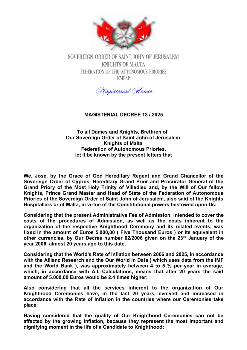 please see below and read carefully the official Magisterial Decree about the New Admission Fee of KMFAP, which was issued and came into effect on the 17th November 2025:
